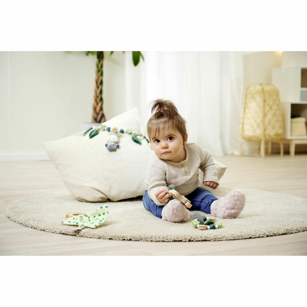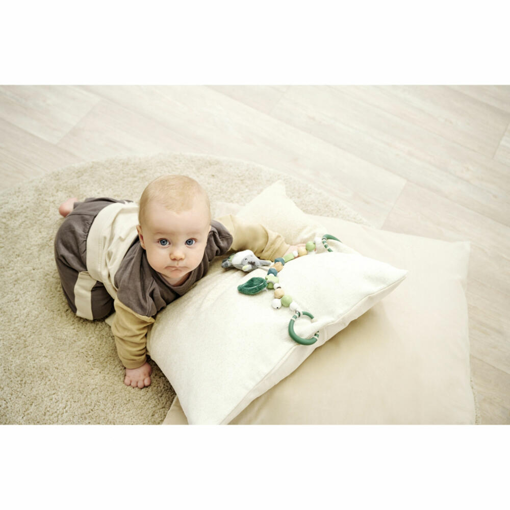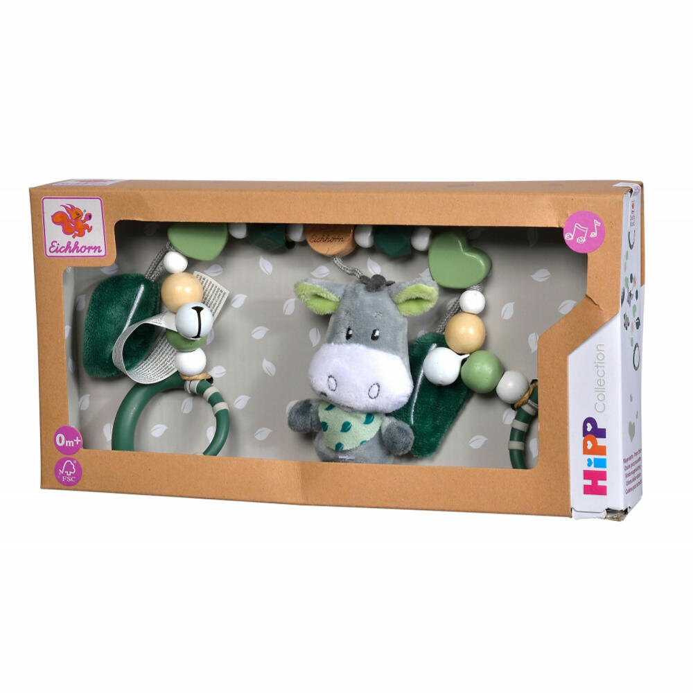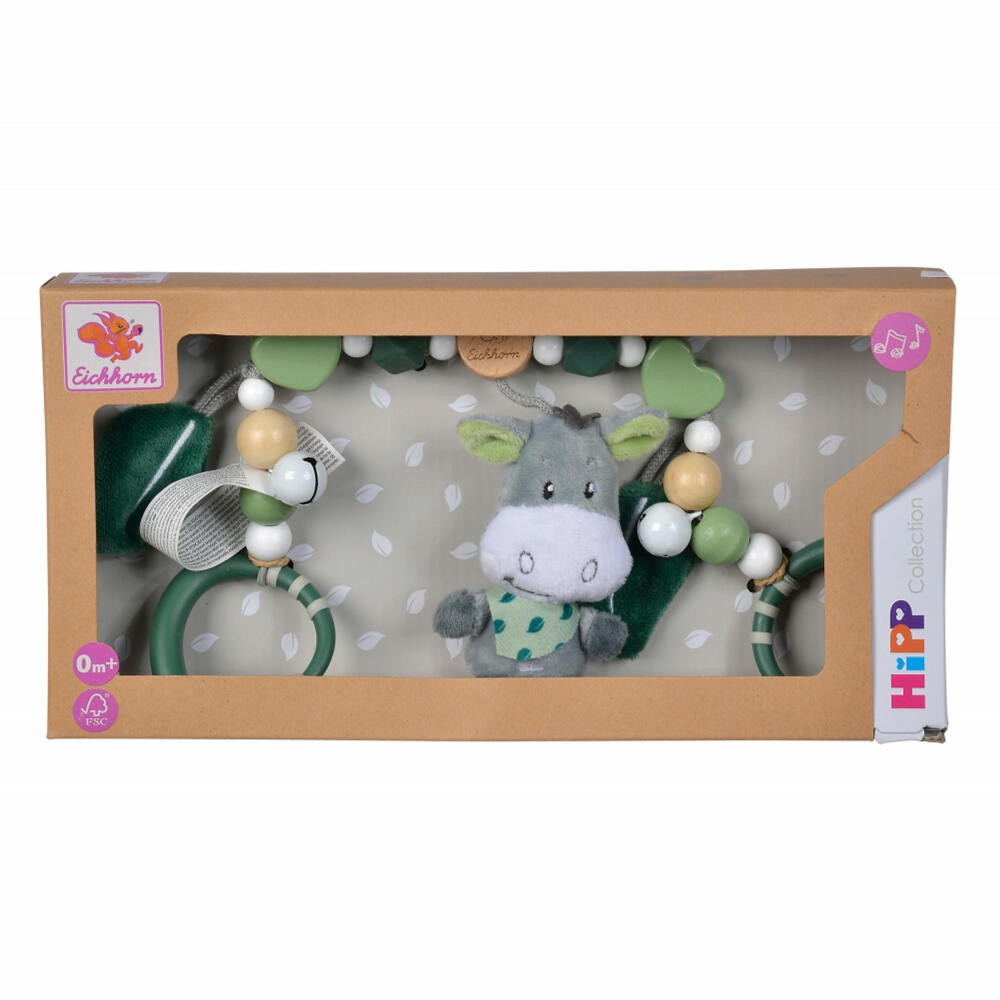 Eichhorn Baby HIPP pram chain: The high-quality Eichhorn Baby HIPP pram chain made of beech wood not only has different tactile stimuli. The little bells on the chain ring gently when moved. The various tactile beads made of beech wood and silicone, as well as the cute plush elements in the shape of leaves and donkeys, become a sensory experience for little hands and are a real eye-catcher. Only wood from sustainable forestry is used to make the pram chain. Suitable for babies from the first month of life.