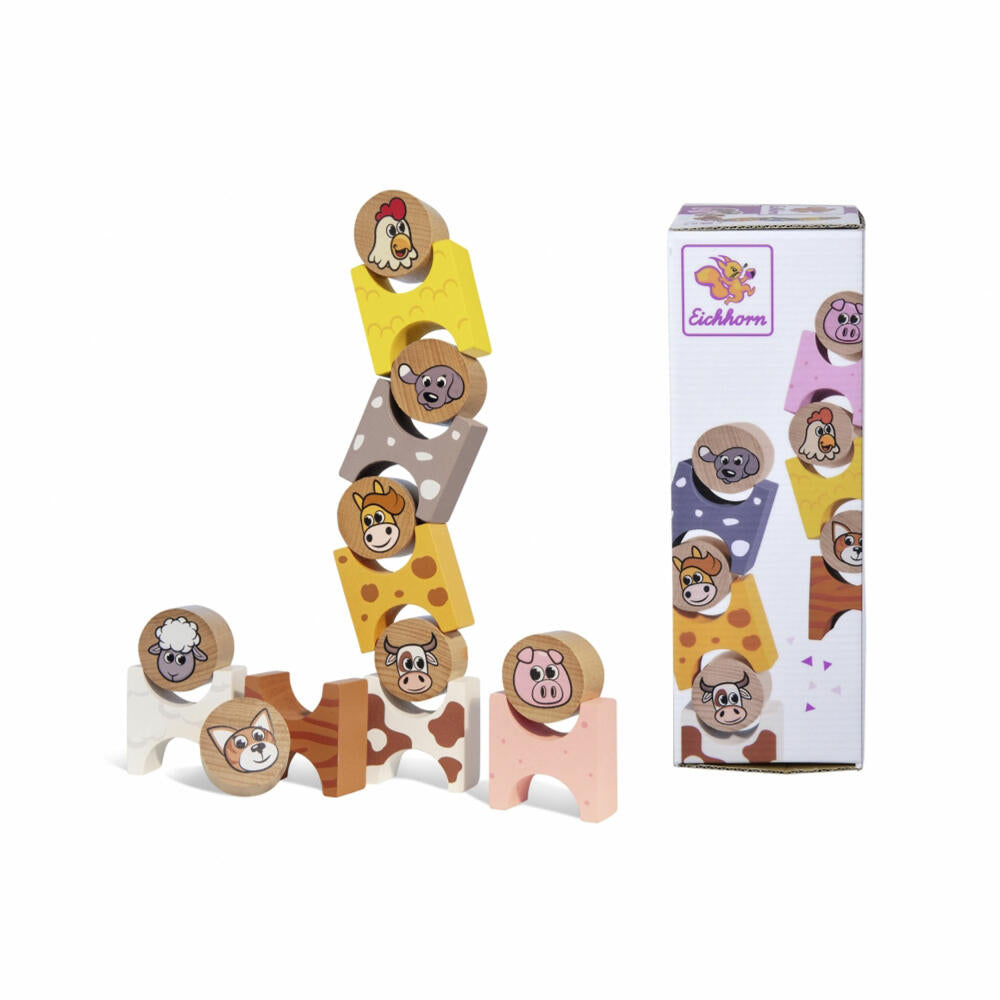 Eichhorn stacking game: With the farm stacking animals, towers are built from funny building blocks. The round stones with the funny heads must be skillfully placed into the square stones with round recesses. The farm stacking animals specifically promote motor skills and hand-eye coordination in children aged 2 and over. Only wood from sustainable forestry is used to produce Eichhorn products.