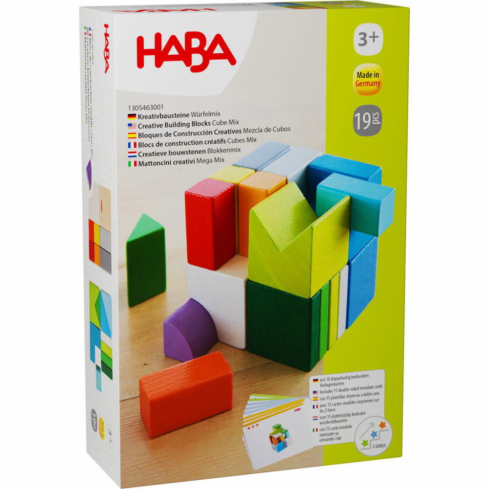 With these brightly colored building blocks in a variety of shapes and sizes, children from 3 years of age can become creative architects. The 3D cube mix building game from HABA offers countless laying and stacking options with a total of 19 different wooden building blocks. In the accompanying leporello, children will find beautiful pre-algae to recreate. When laying, stacking and building, they train fine motor skills, spatial imagination and creativity. The 3D cube mix building game is part of HABA's high-quality wooden toy range for children from 3 years of age.