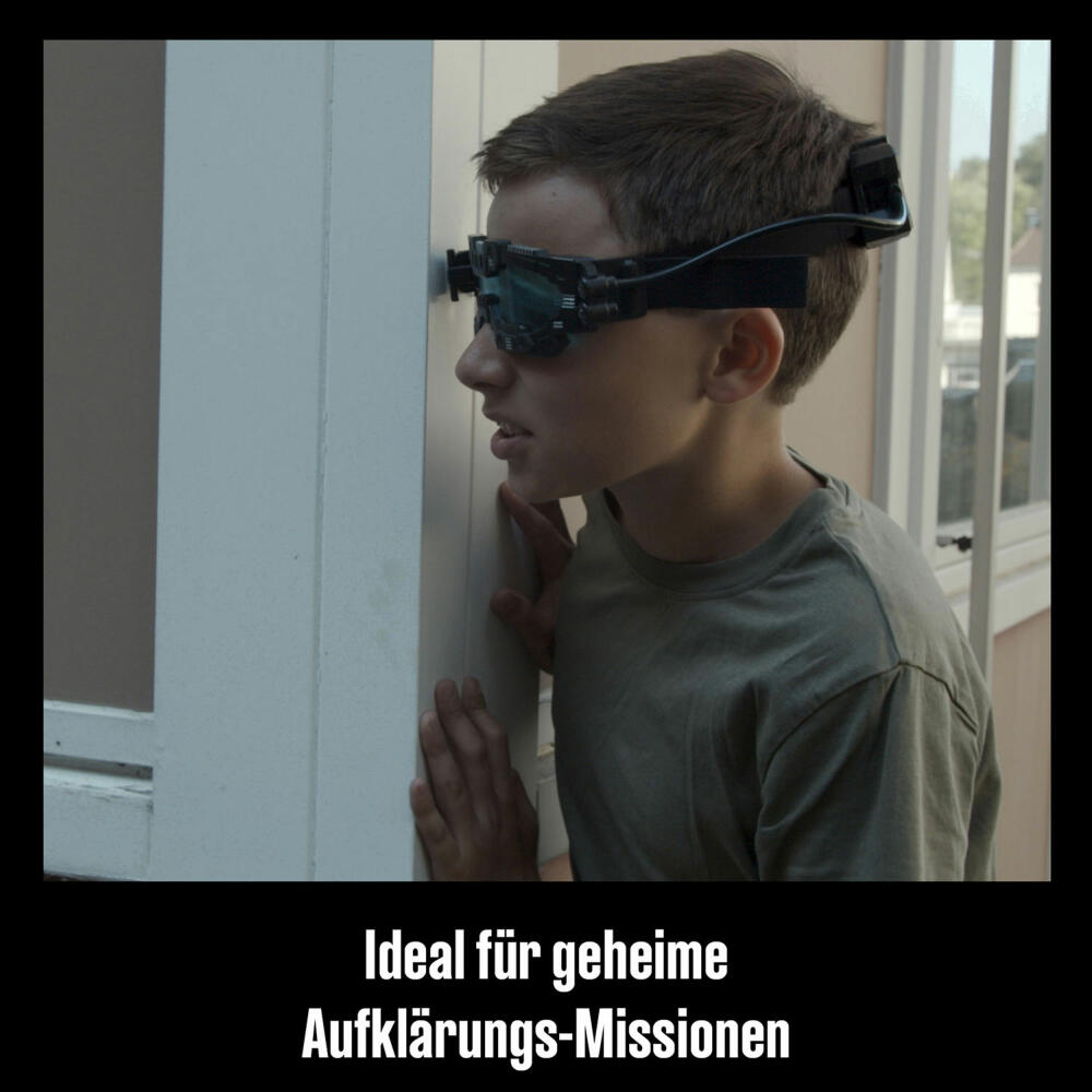 Secret explorations in the dark! Follow hidden clues, illuminate corners, decipher symbols - these cool glasses belong in every detective's case! The two fold-out magnifying lenses make even the smallest traces visible. The removable lamp with green LED spotlight can be attached to the temples of the glasses with a click. With an elastic band it turns into a headlamp. Now just plug in the batteries and discover hidden things in the dark, almost like with night vision equipment or night vision goggles. An ideal gift for children aged 8 and over.