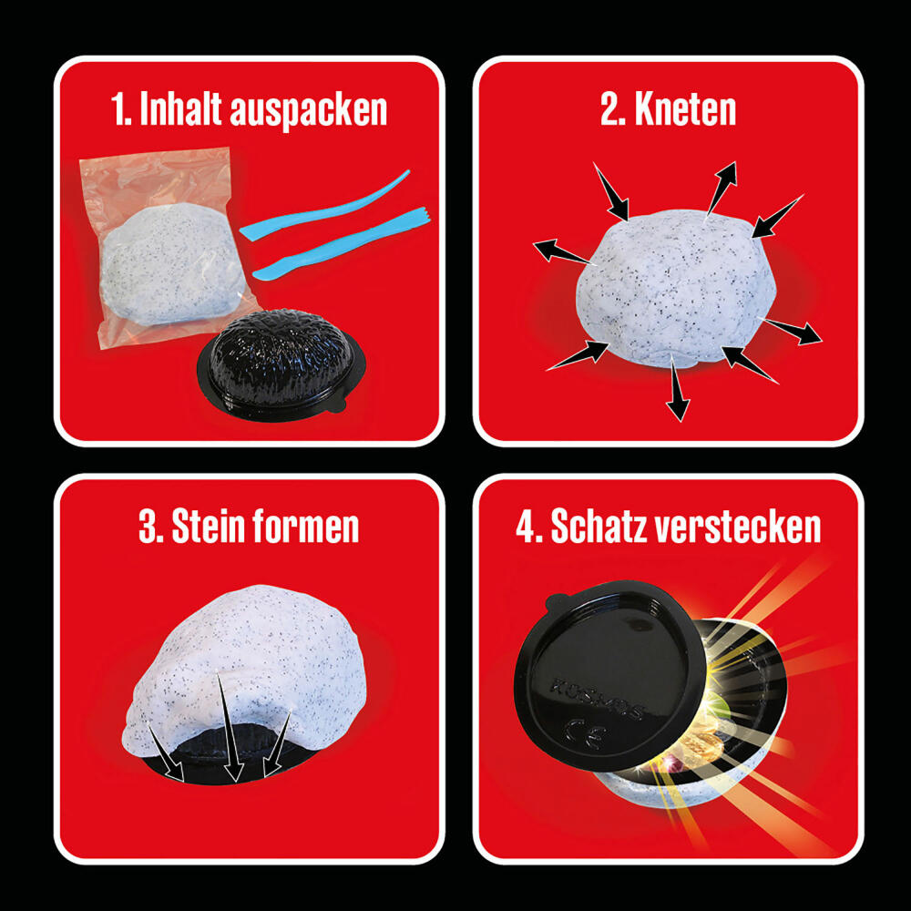 There is no safer place for top secret messages, a key or a valuable treasure! The Three Investigators' secret hiding place is hidden on the underside of a stone made of air-drying modeling clay. Before the detective game begins, young detectives aged 8 and over make their very own hiding place: The children press the modeling clay onto a mold and model the stone as realistically as possible. This way it remains discreetly hidden from prying eyes in the children's room or garden. Simply follow the clear instructions that show how to work the stone with the modeling tool and close the secret compartment. Justus, Peter and Bob would be delighted: No one will find this hiding place!