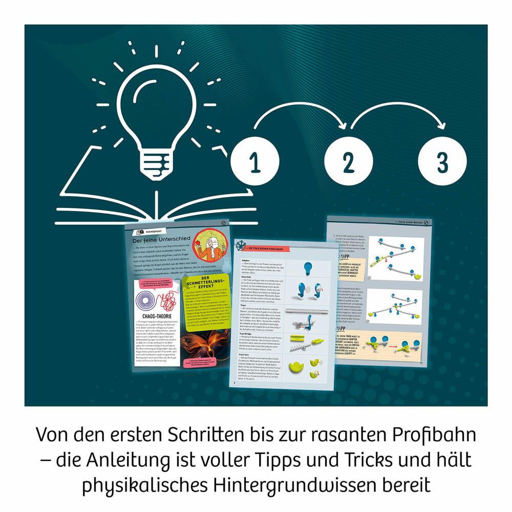 On the floor is a thing of the past, now it's time to go vertical! Fast curves, clever levers, flexible tracks: This innovative marble run is the ultimate experience for beginners and advanced players, and is absolutely unique every time it is set up. With the residue-free nano adhesive pads, the tracks made of bio-based plastic are individually attached to vertical, smooth surfaces and can be moved and finely adjusted in a matter of seconds. Whether around corners or over obstacles, whether on doors, glass panes, tiles or shelves - now it's time to test what is possible. The children decide for themselves how challenging their track will be and how experimentally they will deal with free fall and gravity. Here the track grows with their experience!