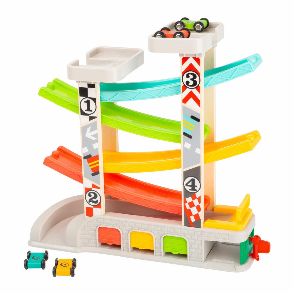Ready, set, go! This 7-piece play set promises fast-paced driving fun. Four different colored wooden cars are waiting to race down the colorful race track. The set includes two parking decks from which two racing cars can be started at the same time. The racing cars stop at the gas station for a quick pit stop and the vehicles can be parked in the three garages after setting off. This way they don't get lost when the race track is being transported. This game promises action and long-lasting fun for all little fans of car racing!