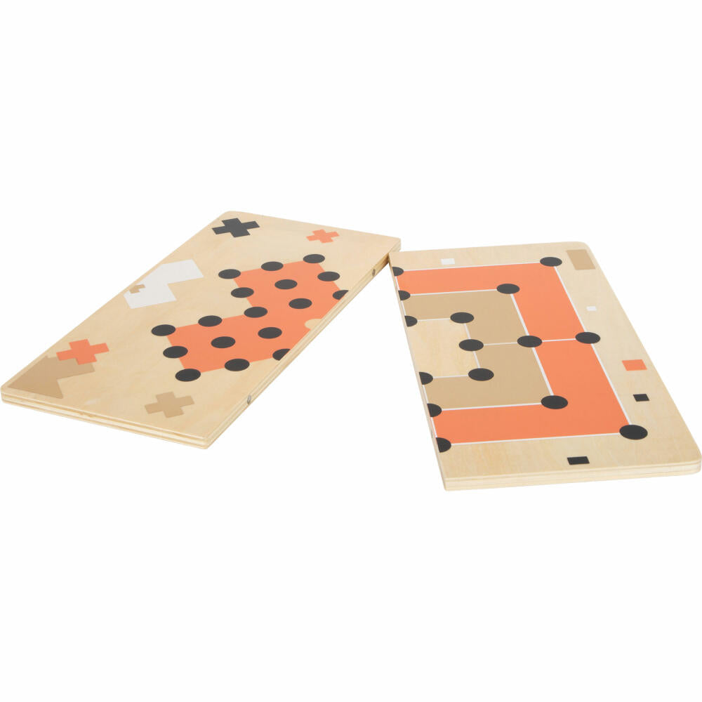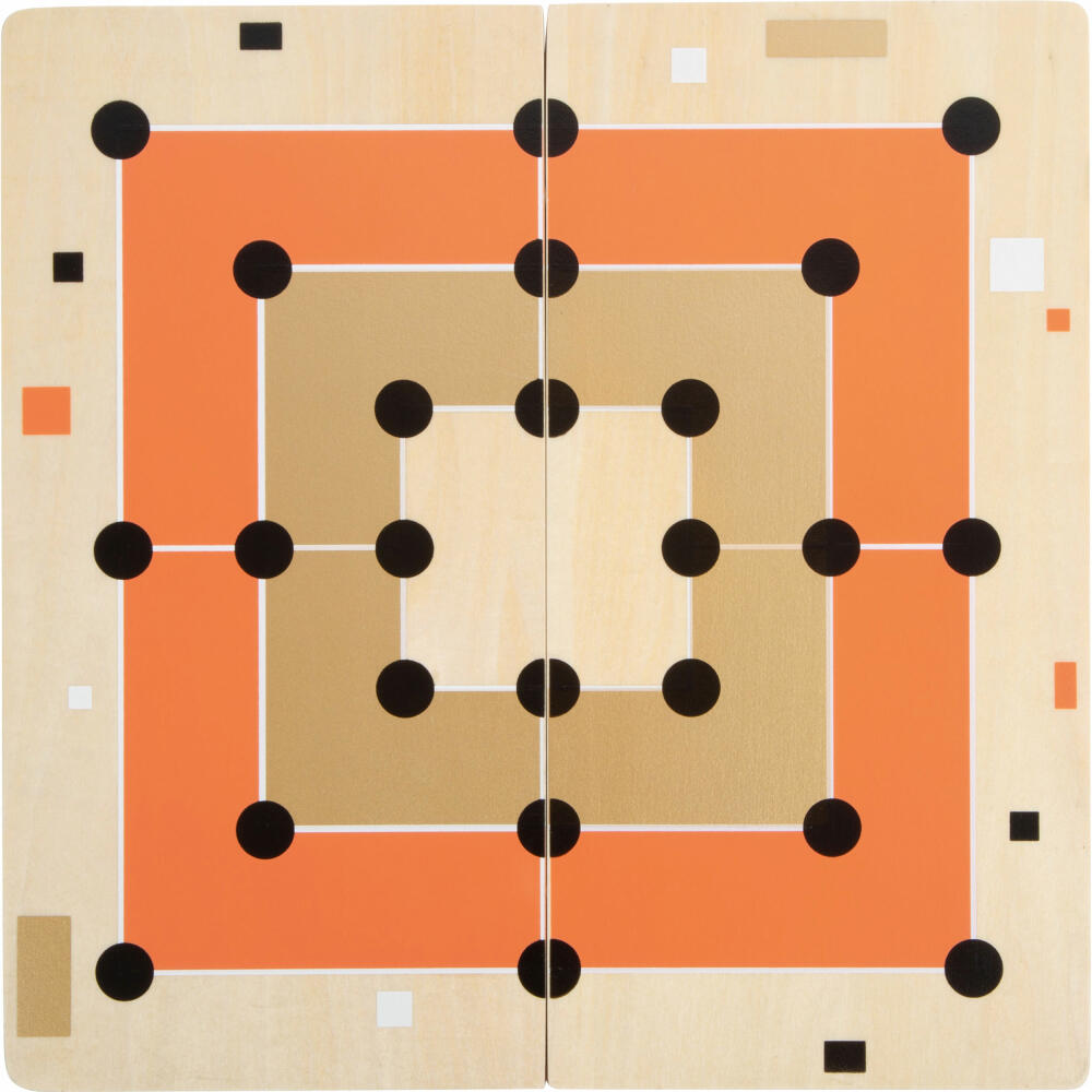 These two classic games, Nine Men's Morris and Solitaire, impress with their elegant, modern look and are guaranteed to be an eye-catcher at games night! The sophisticated gold accents are particularly effective in combination with terracotta, clear black/white and lots of natural wood. The 2-in-1 game board is divided into two parts and can therefore be stored to save space. Embedded magnets ensure that both halves of the game board stay firmly together. With high-quality game box for storage. A stylish board game with a reduced design look. The solid wooden game pieces feel particularly comfortable when playing.