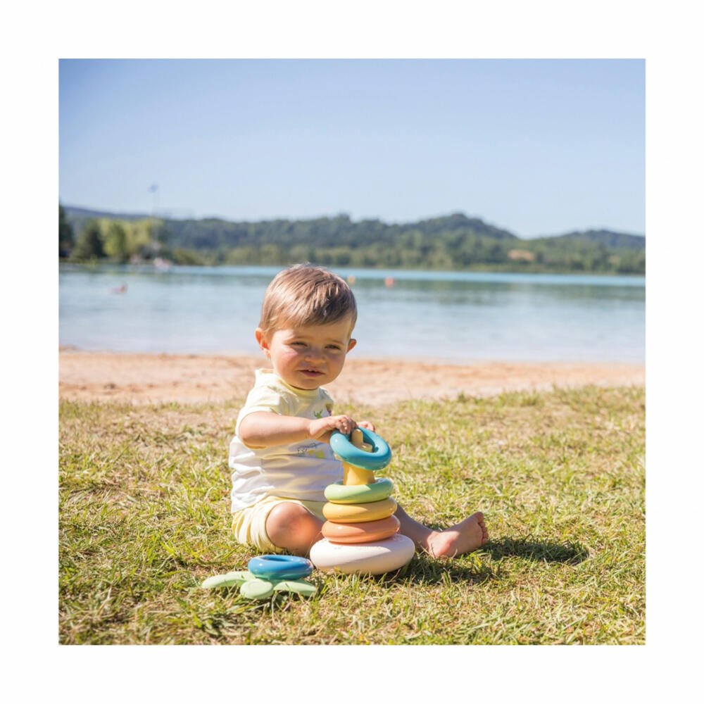 Smoby Green - the sustainable bioplastic toy made from sugar cane! The Little Smoby Green ring pyramid is made from 90% renewable sugar cane, is fully recyclable and therefore particularly environmentally friendly. The stacking pyramid in trendy colors is a classic among baby and toddler toys. 5 sturdy plastic rings in bright colors can be placed one after the other on the swing base. The child is playfully familiarized with colors and proportions and trains their coordination at the same time. The flower can be placed right on top, the blossom can be rotated and thus offers additional play incentives. The pyramid can be moved back and forth on its swing base. The packaging made of recycled cardboard is of course also fully recyclable.