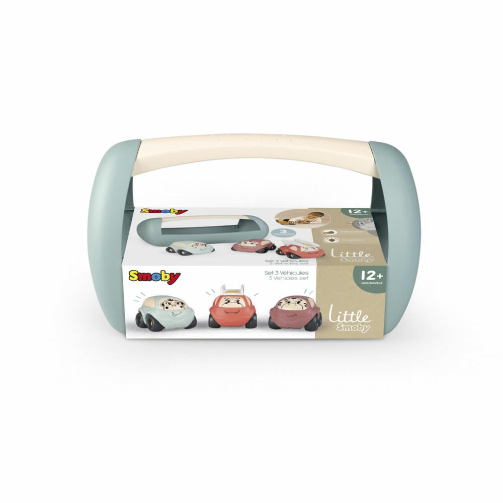 The Little Smoby Mini Racer Set contains three child-friendly toy vehicles and a handy transport box with a handle. Thanks to their round shape and robust construction, the little racers are ideal for small children aged 12 months and up and help develop motor skills. There are two cars with cute animal faces and a fire engine with a ladder.