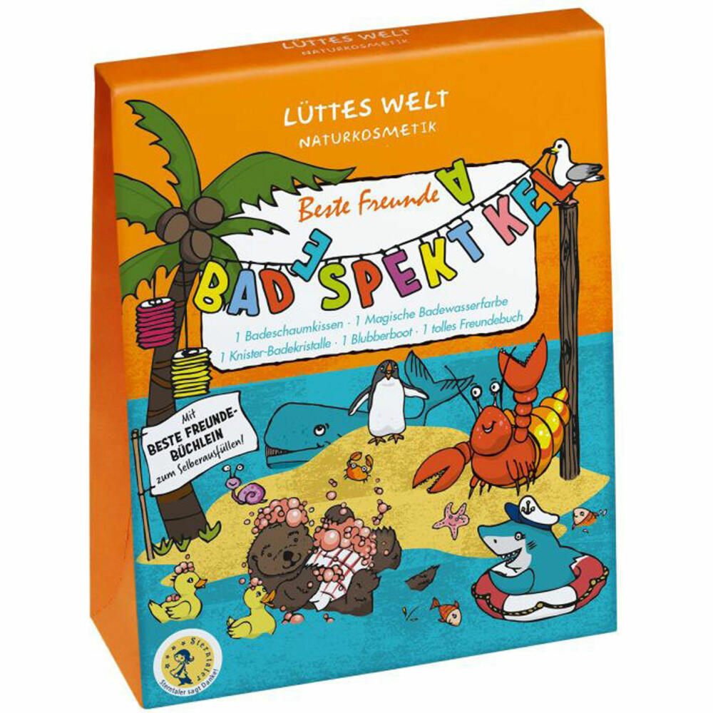Lüttes Welt bathing spectacle, motif: Best Friends, contents: 1 bath foam pillow, 50g, 1 magical bath water color, 60g, 1 crackling bath crystals 80g, 1 bubble boat 70g, 1 best friends booklet