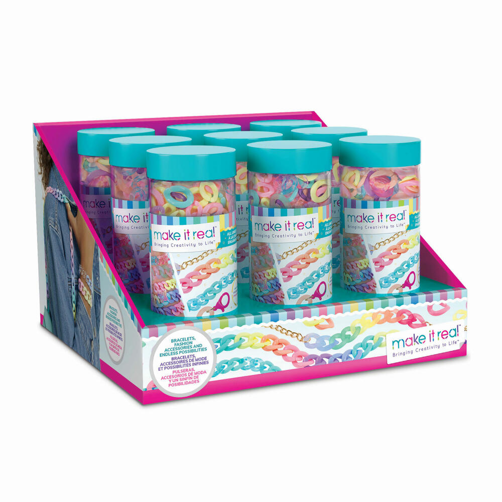 Contents: 300 different colorful chain elements, 2 metal chains 13cm, 1 butterfly pendant, 4 plastic snap fasteners, 4 pairs of snap fasteners, 6 jump rings, 1 instruction manual