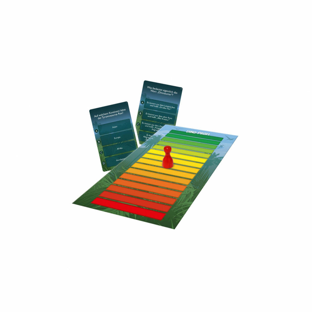 Together you try to answer questions in order to advance your playing piece on the game board. Depending on the level of difficulty, you have to answer a different number of the 110 question cards to reach the finish. Whoever is currently on the move can say the answer directly. However, if you are unsure of the answer, you can ask your team of other players. Depending on this, you can advance more or less slowly on the game board. There is also a game variant for one person.