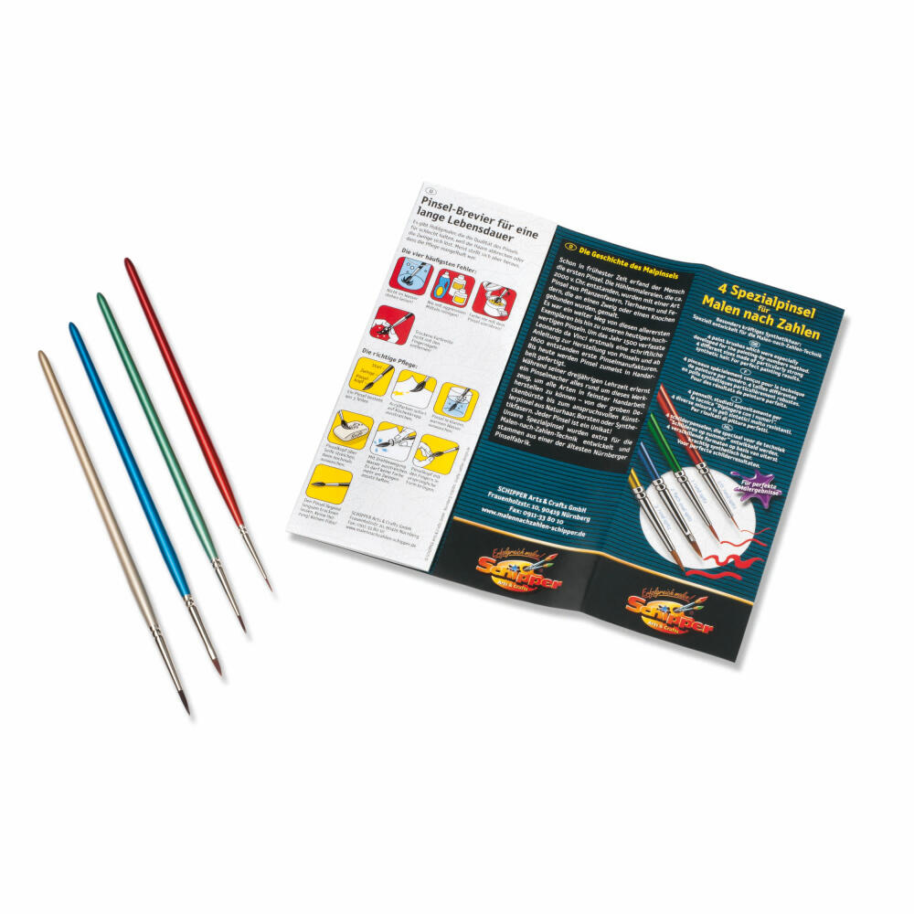 Nevertheless, the large circle of paint-by-numbers fans demands an increase in precision when coloring. The new special brush set was developed for the paint-by-numbers hobby and meets the high demands of hobby painters. Features: Particularly strong synthetic hair. Each brush size has the same handle diameter of approx. 6 mm and is therefore easy to guide and sits nicely in the hand. Elegant handle varnish in 4 different metallic colors. Individual packaging in transparent tubes for careful storage. Instructions and small brush guide for a long service life of the high-quality paint brushes. The four special brushes are manufactured in one of the oldest brush factories in Nuremberg.