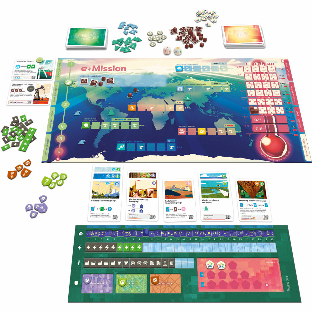 In this cooperative connoisseur game, players take on the role of major nations and try to achieve the big goal together: to reduce global emissions to zero in order to stop global warming! A highly topical issue, brilliantly implemented with a catchy card mechanism and a very strong connection to reality. The game is produced in Germany without any plastic and is CO2-neutral.