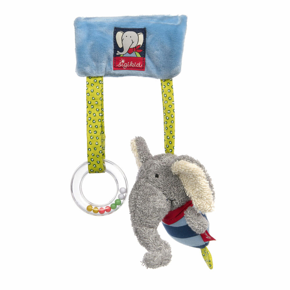 To ensure that trips and car journeys don't get boring, the cute elephant is also available as a pendant. The baby toy can be easily attached above the child to the arch of the baby seat or the canopy of the stroller using Velcro. The elephant with the long trunk and the rattle ring filled with colorful beads then dangle within the baby's reach. The pretty pendant for playing and discovering keeps even the littlest ones in a good mood when they're out and about. As the ring rattles even when lightly touched, it arouses the baby's curiosity. The squeaker integrated into the animal also provides joy and encourages the child to explore the pendant with all of their senses. All materials are of high quality and can withstand frequent washing at 30 °C in the washing machine. The rattle ring is attached using Velcro and should be removed before washing. The baby toy is recommended from birth.
