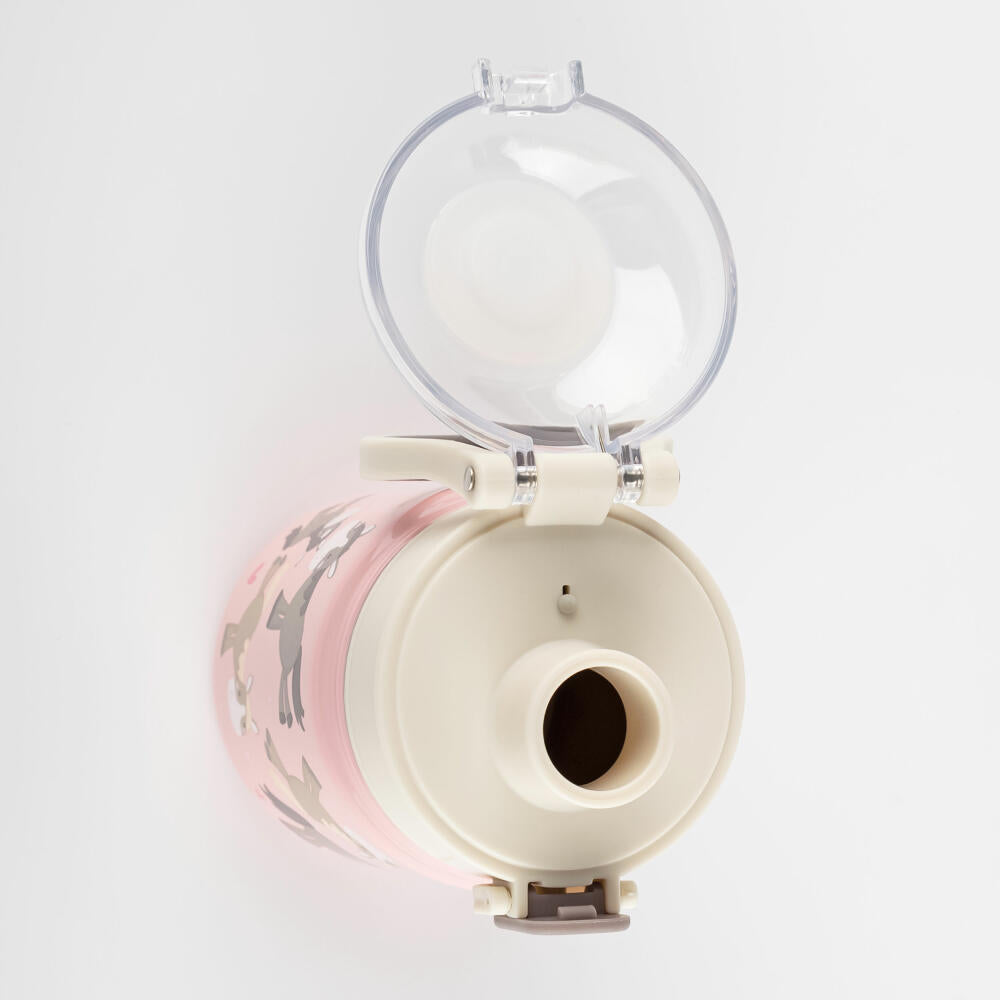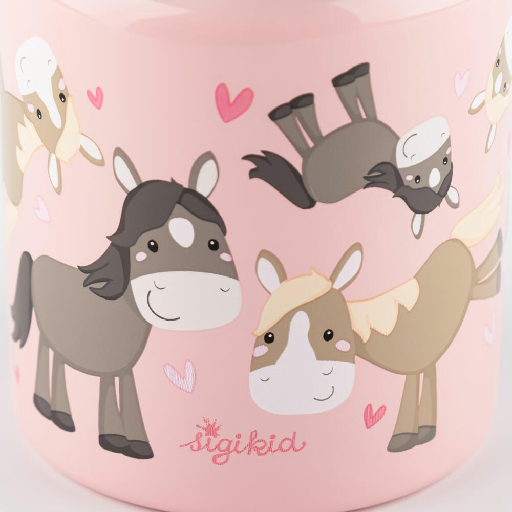 Don't forget to drink! Every child's backpack should have a drinking bottle as a daily companion. It has to be hygienic, be able to withstand a lot, and ideally make drinking a pleasure with a favorite motif. This pink drinking bottle with the horse motif holds 400 ml and has an easy-to-use snap closure with a handle. The mouthpiece, handle and button are made of polypropylene (PP), the transparent plastic lid is made of Tritan. The bottle itself is made of stainless steel. All materials are of course suitable for contact with food. The stainless steel bottle is uncoated on the inside and heat-resistant. But BEWARE! It is not insulated and therefore you should not fill it with hot drinks. The children's drinking bottle is unbreakable, robust and durable. The stainless steel material is tasteless and odorless. Furthermore, the drinking bottle can be easily filled through the wide filling opening. Thanks to a silicone seal, the drinking bottle is leak-proof. However, please avoid filling it with carbonated drinks, as the excessive pressure could cause the bottle to leak. The bottle is recommended for children aged 1 to 8 years. For the sake of the beautiful print, sigikid recommends cleaning by hand, so your little one can enjoy their bottle for a long time. The mouthpiece can be completely dismantled for optimal cleaning. sigikid places particular emphasis on selected materials and well thought-out design