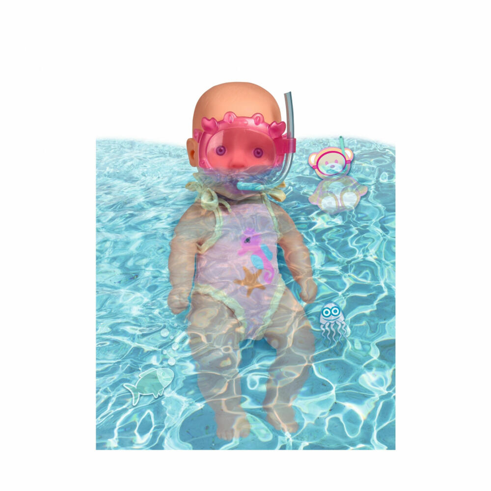 Little doll mommies can splash around and go swimming with the New Born Baby bathing doll. The doll wears a cute swimsuit with a sweet seahorse and starfish print, which can be tied at the shoulders and taken off. Diving is no problem with the pink swimming goggles and snorkel. The New Born Baby bathing doll from Simba Toys is perfect for playing in the bathtub, is 30cm tall and suitable for children aged 3 and over.