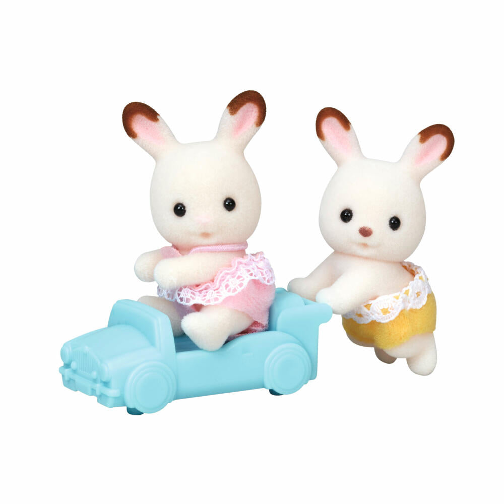 Sylvanian Families are cute, velvety dolls for children. The chocolate bunny twins Breeze and Kabe are very lively and not at all shy. Sometimes they romp around until one of them falls asleep. The set includes two chocolate bunny twin figures and a small push-along vehicle.