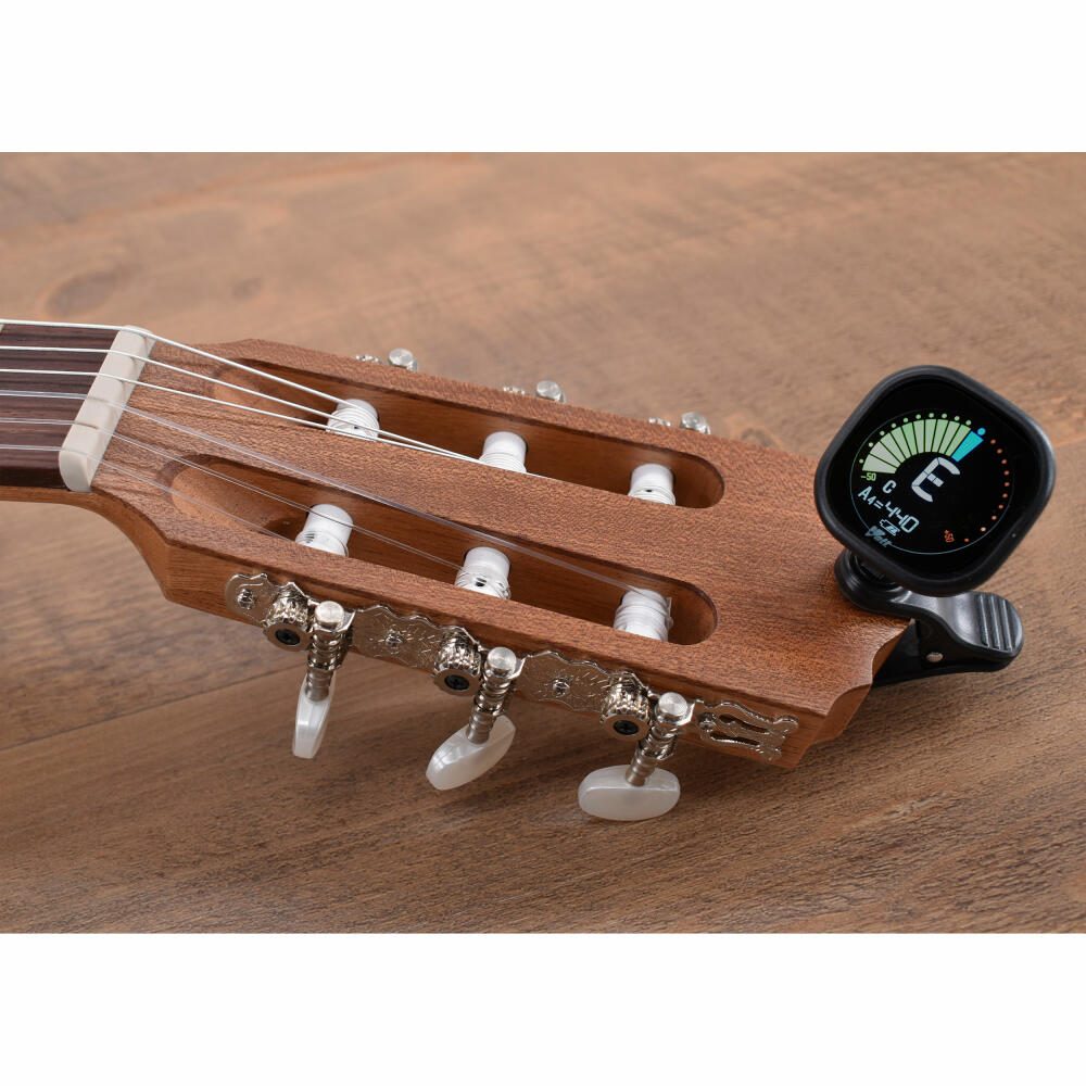 The clip tuner is simply clipped onto the headstock or a similar part of the instrument, can be rotated 360° and enables perfect tuning even in noisy environments. The built-in contact microphone only reacts to the vibrations of the instrument, not to ambient noise, and the large display with high color contrast enables comfortable tuning even in poor lighting. The integrated safety switch automatically switches the tuner off when not in use to extend the battery life.