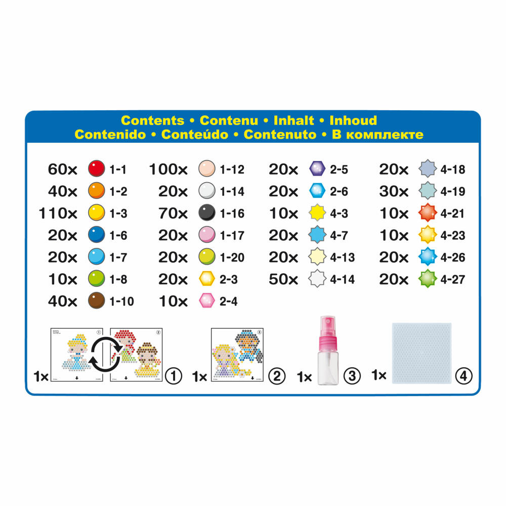 Mit diesem Aquabeads Disney Prinzessinnen Sternperlen Set können die zauberhaften Disney Prinzessinnen Arielle, Rapunzel, Belle, Cinderella und Jasmin mit den tollen Sternperlen gebastelt werden. Im Bastelset sind neben den Motiv-Vorlagen und über 800 Bastelperlen, eine Bastelplatte und ein Sprüher enthalten. Die Aquabeads Bastelperlen verbinden sich ähnlich wie Bügelperlen. Der Unterschied? Du musst deine Perlenkreation nur mit Wasser besprühen und sie verbinden sich magisch. Kein Kleber oder Bügeln notwendig. Für Kinder ab 4 Jahren geeignet.