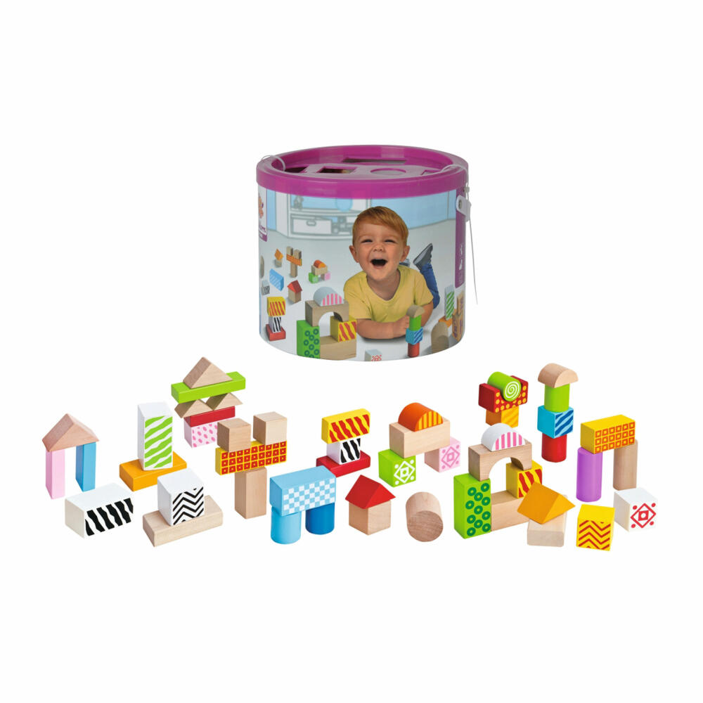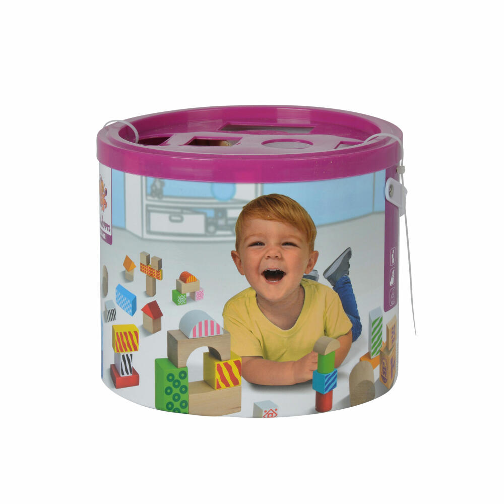 Eichhorn Color, Holzbausteine: Das 50-teilige Eichhorn Color Holzbausteine Set besteht aus vielen bunten Steinen verschiedenster Formen. Die Eichhorn Color Holzbausteine werden in einer sehr vorteilhaften Trommel geliefert, somit können die Bausteine kinderleicht nach dem Spielen Ihres Kindes verstaut und bei Belieben wieder herausgeholt werden. Im Deckel der Trommel sind Lochausstanzung mit den unterschiedlichen Bausteinformen, dies sorgt für einen zusätzlichen Nutzen der Trommel: Dem Steck-Prinzip, bei dem Kinder Formen und Farben kennenlernen.