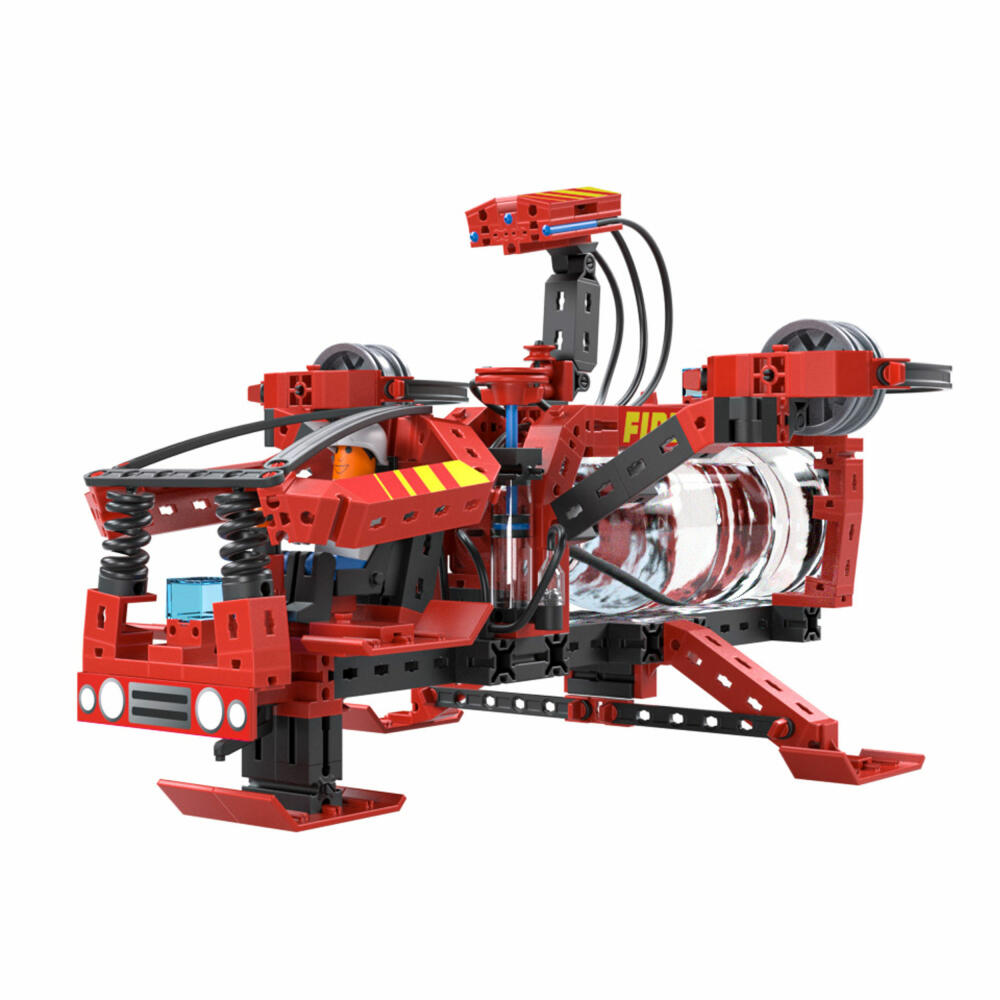 Tatü-tata, die Feuerwehr ist da – und ist definitiv aus keinem Kinderzimmer wegzudenken. Mit den drei tollen Modellen können schon im Kinderzimmer große Heldentaten verübt und ganze Städte gerettet werden. Im Baukasten enthalten ist ein Adapter für eine herkömmliche PET-Flasche, die im Modell verbaut und als Wassertank genutzt wird. So erlernen die Kinder die Bedeutung von Nachhaltigkeit und dass man – auch auf lustige Art und Weise – Alltagsgegenstände ganz unterschiedlich verwenden kann. Über eine Luftpumpe wird in der, mit Wasser gefüllten, PET-Flasche Druck erzeugt. Öffnet man das Ventil, spritzt das Wasser aus bis zu drei Spritzen aus dem angeschlossenen Feuerwehrschlauch. So lernen die Kinder spielerisch den Zusammenhang von Luft- und Wasserdruck. Zusammen mit dem enthaltenen Männchen, dem fischertechNik, erleben die Kinder viele spannende Abenteuer: Es werden heldenhafte Einsätze durchlebt, Brände gelöscht und Menschen gerettet.