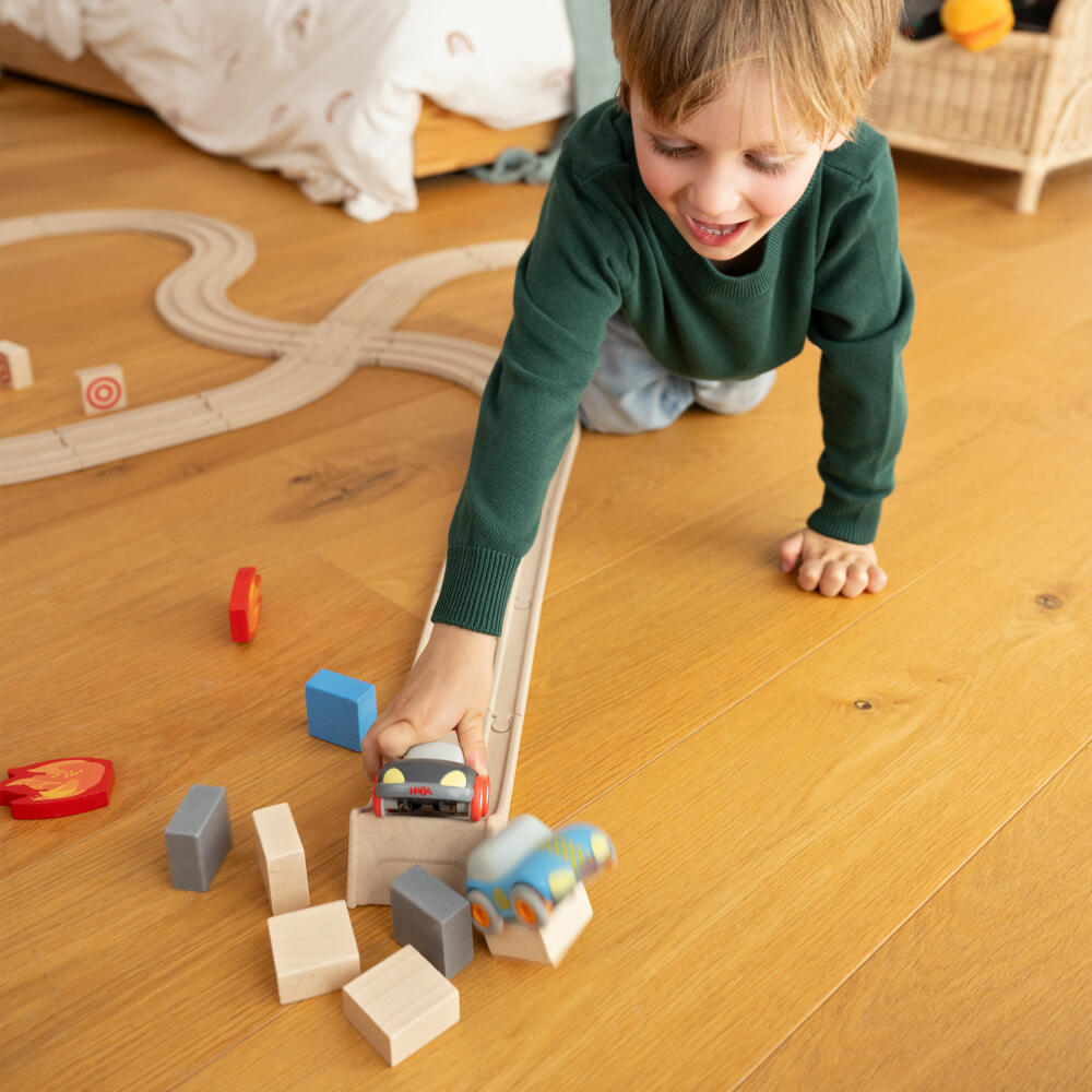 Auf die Plätze, fertig, HABA Cars! Die actiongeladene Rennbahn ist ideal für kleine Autofans. Extragroße Streckenelemente mit einfachen Steckverbindungen sorgen für einen schnellen und unkomplizierten Aufbau, auch ohne Hilfe von den Großen. Die stabilen Flitzer liegen super in den kleinen Kinderhänden und sind mit einem Schwungmotor ausgestattet - so räumen sie mit viel Schwung jedes Bausteinhindernis aus dem Weg, auf und neben der Rennstrecke! Keine Batterien erforderlich.