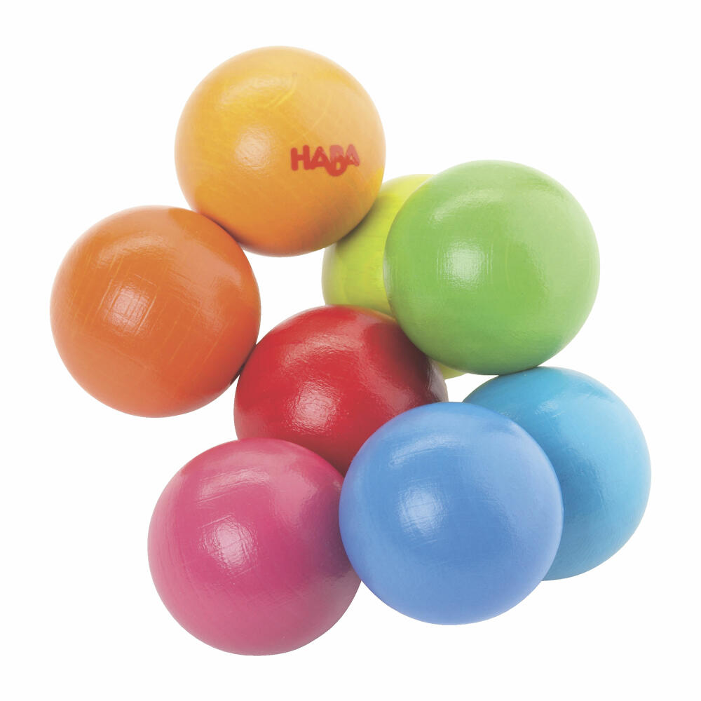Bunte Kugeln, die wie magisch aneinander hängen - das ist der HABA-Greifling Magica. Dieser Greifling besteht aus 8 farbigen Kugeln aus Buchenholz, die auf ein strapazierfähiges Polyesterband gefädelt sind. Die runden Formen liegen schön in der Hand und die freundlichen, bunten Farben regen zum Entdecken und Greifen an. Schüttelt das Baby den Greifling, klappern die Kugeln, wenn sie sich berühren. Und außerdem lassen sie sich nahezu nach Belieben drehen und wenden. So entstehen immer wieder neue Formen und Figuren - langweilig wird das nie! Selbst sehr große Babys können sich noch stundenlang damit beschäftigen.