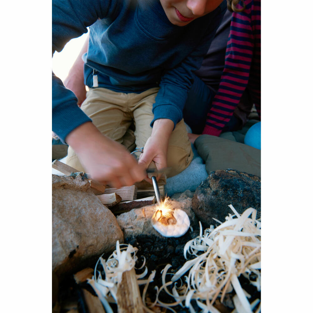 Das Terra Kids Feuerstarter-Set von HABA ist ideal zum Entzünden eines Lagerfeuers beim Zelten. Der zweckmäßige Feuerstift aus Holz und Metall lässt sich kinderleicht bedienen: Den Abzieher einfach mit Schwung über den Feuerstift ziehen, schon entstehen Funken, die den Anzünder - ein mit Wachs getränktes Wattepad - entzünden. Der Zündstahl reicht für mehrere tausend Zündungen und funktioniert auch bei Nässe und Kälte. Mit dem praktischen Terra Kids Feuerstarter-Set können schon kleine Abenteurer gemeinsam mit den Großen und ganz ohne Feuerzeug selbstständig ein Lagerfeuer im Wald anzünden.