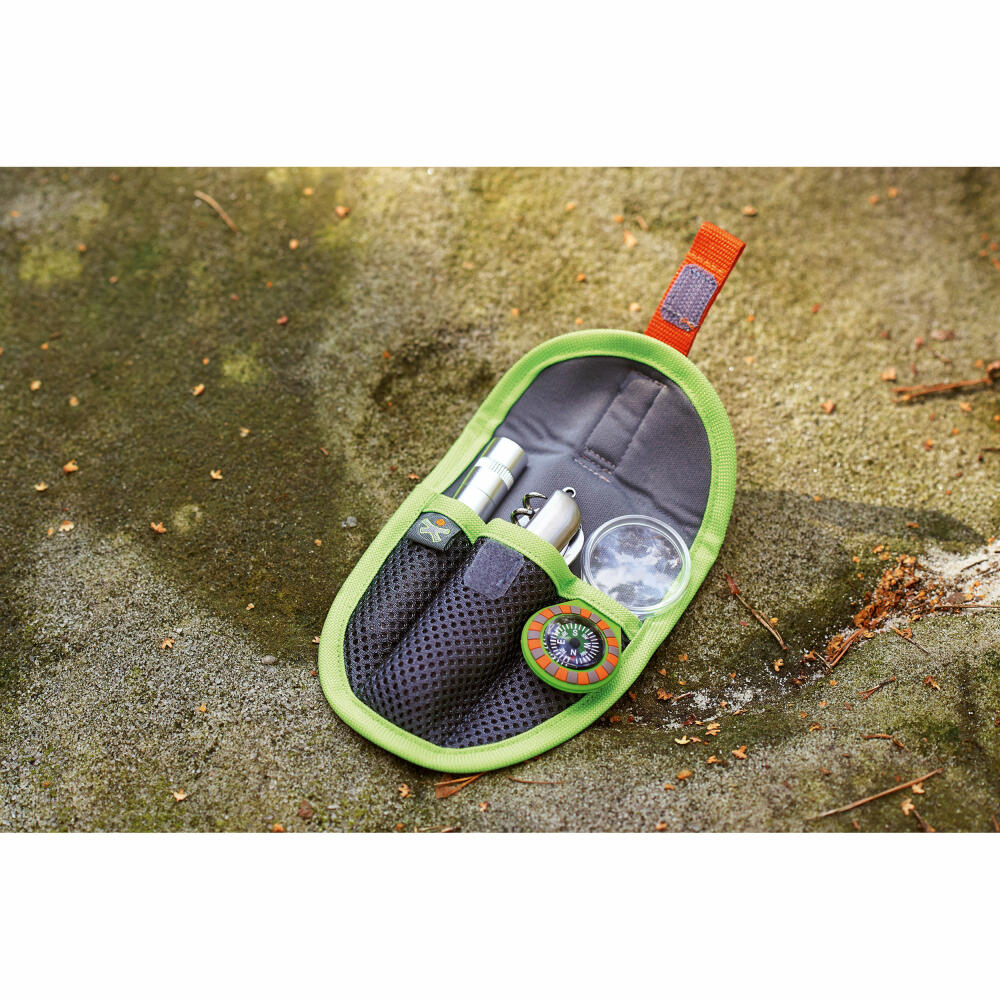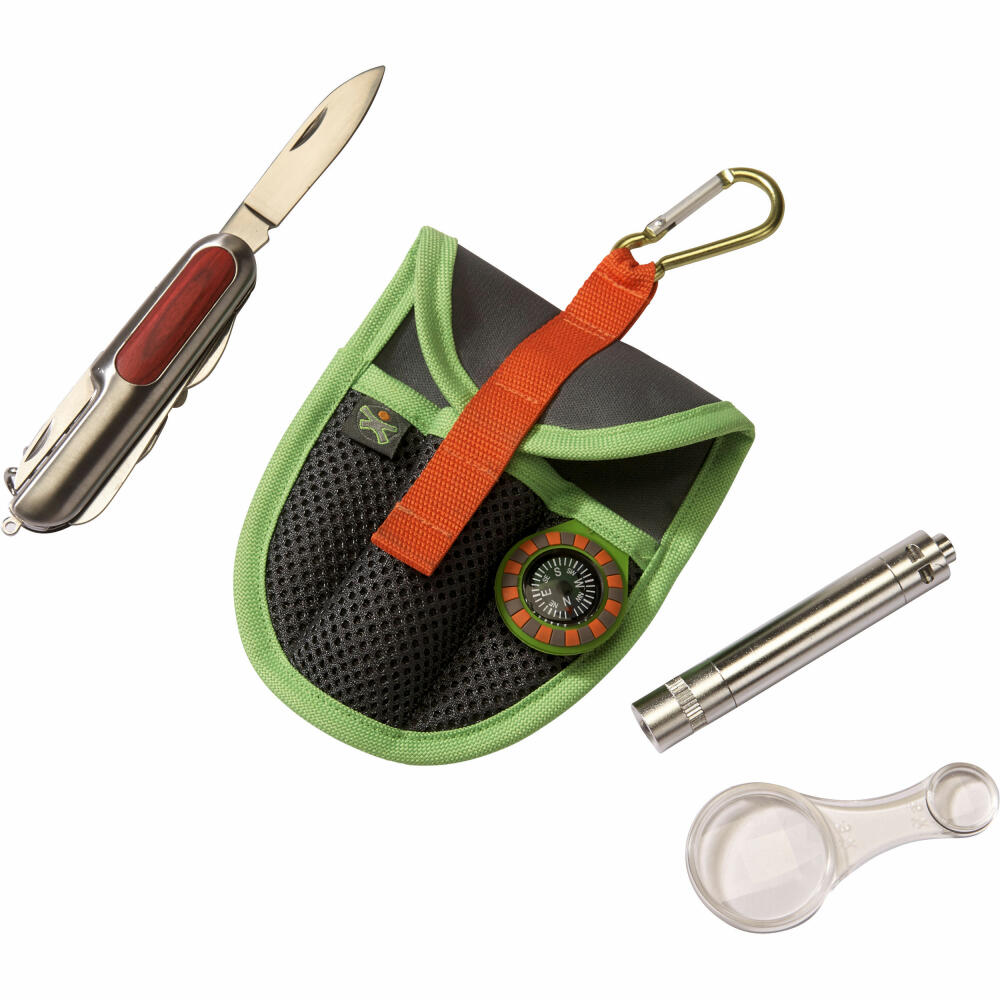 • Das Forscher-Set umfasst ein Taschenmesser mit 6 Funktionen, eine LED-Leuchte, eine Lupe und einen Kompass