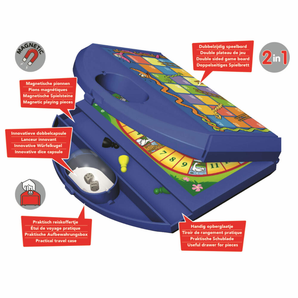 Das Kompaktspiel enthält zwei Spiele: das klassische Gänsespiel und Schlangen & Leitern.