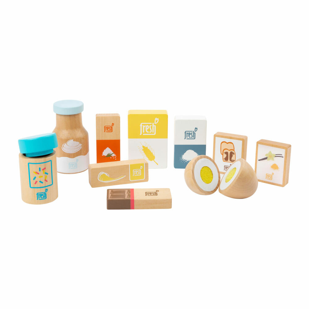 Bäcker und Konditoren aufgepasst! Dieses 10-teilige Backzutaten-Set bietet alles, was die Herzen kleiner Bäckermeister höher schlagen lässt. Neben Mehl, Zucker, Sahne, Salz und Backpulver findet sich auch ein Päckchen Vanillezucker sowie ein teilbares Ei. So gelingt garantiert in jeder Kinderküche der Kuchenteig! Der fertige Kuchen kann nach dem Backen mit der Schokolade und den Streuseln verziert werden. In produkttypischen Farben gehalten und mit leicht verständlichen Bildern versehen, sind diese Zutaten die idealen Zubehörartikel für die Kinderküche oder den Kaufmannsladen.