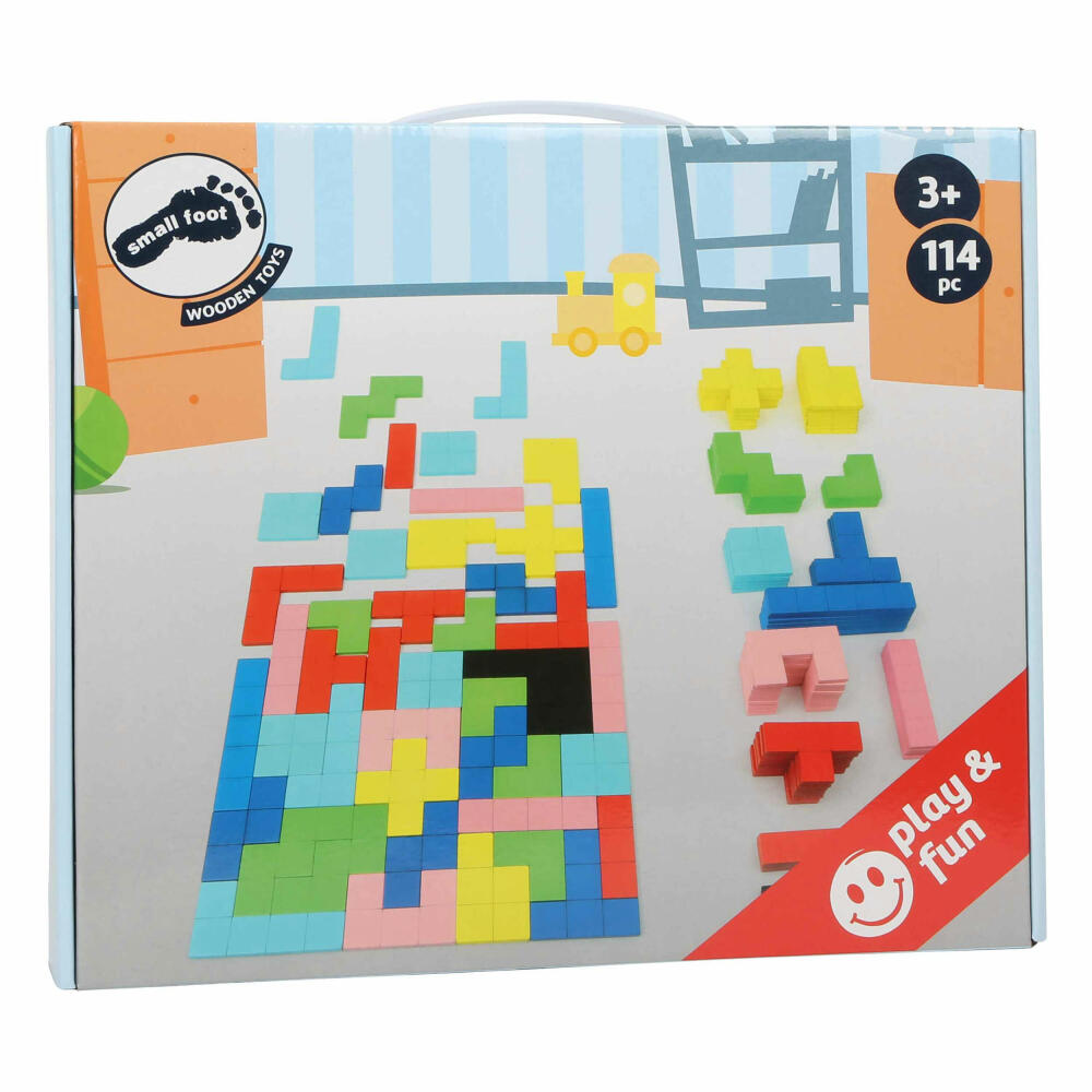 Dieses 114-teilige Spiel-Set aus Holz bietet unendliche Spielmöglichkeiten. Angelehnt an den weltweit bekannten und beliebten Computerspiel-Klassiker gilt es, verschiedene geometrische Muster zu puzzeln. Dabei können mit den unterschiedlichen Spielsteinen bunte und individuelle Mosaik-Flächen in unzähligen Kombinationsmöglichkeiten gelegt werden. Dieses Lernspiel fördert feinmotorische Fähigkeiten und regt die Phantasie an. Zudem trainiert es die Farb- und Formerkennung sowie Problemlösungsfähigkeiten der Kinder.