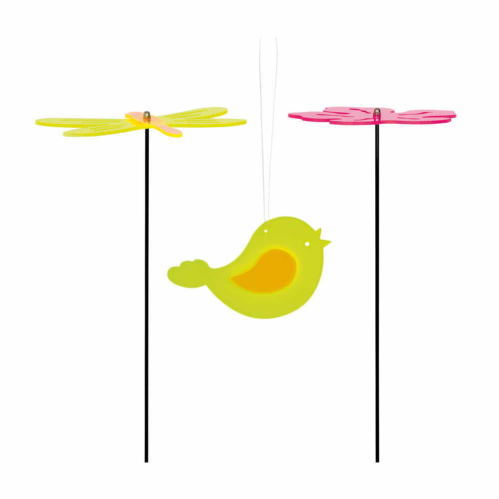 3-er Set. Leuchtend bunte Dekoration für Beete, Blumenkästen oder -töpfe sind Vogel, Blatt und Libelle aus lichtdurchlässigem Acryl! Die Neonfarben strahlen im Sonnenschein noch intensiver.
