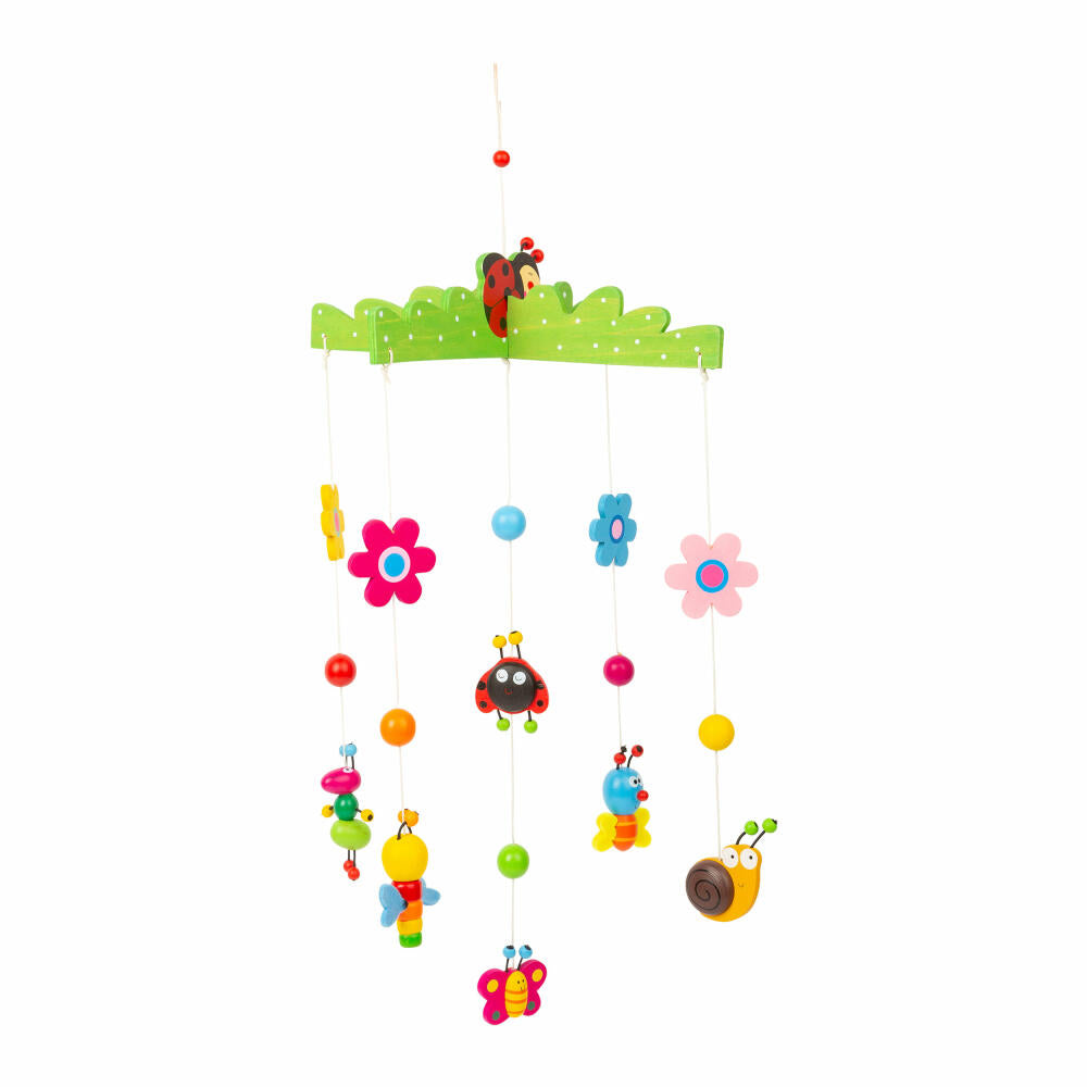 Lasst den Frühling ins Kinderzimmer! Dieses Mobile aus Holz im frischen Frühlings-Design fasziniert kleine Kinder mit seinen vielen bunten Blumen, Schmetterlingen und Schnecken, die fröhlich über dem Wickeltisch oder unter der Kinderzimmerdecke tanzen. So werden die Kleinen ganz spielerisch zum Entdecken und Wahrnehmen animiert. Durch die einfache Steckvorrichtung lässt sich das Mobile in Windeseile zusammenstecken und an der Kordel aufhängen. Ein farbenfroher Hingucker fürs Kinderzimmer.