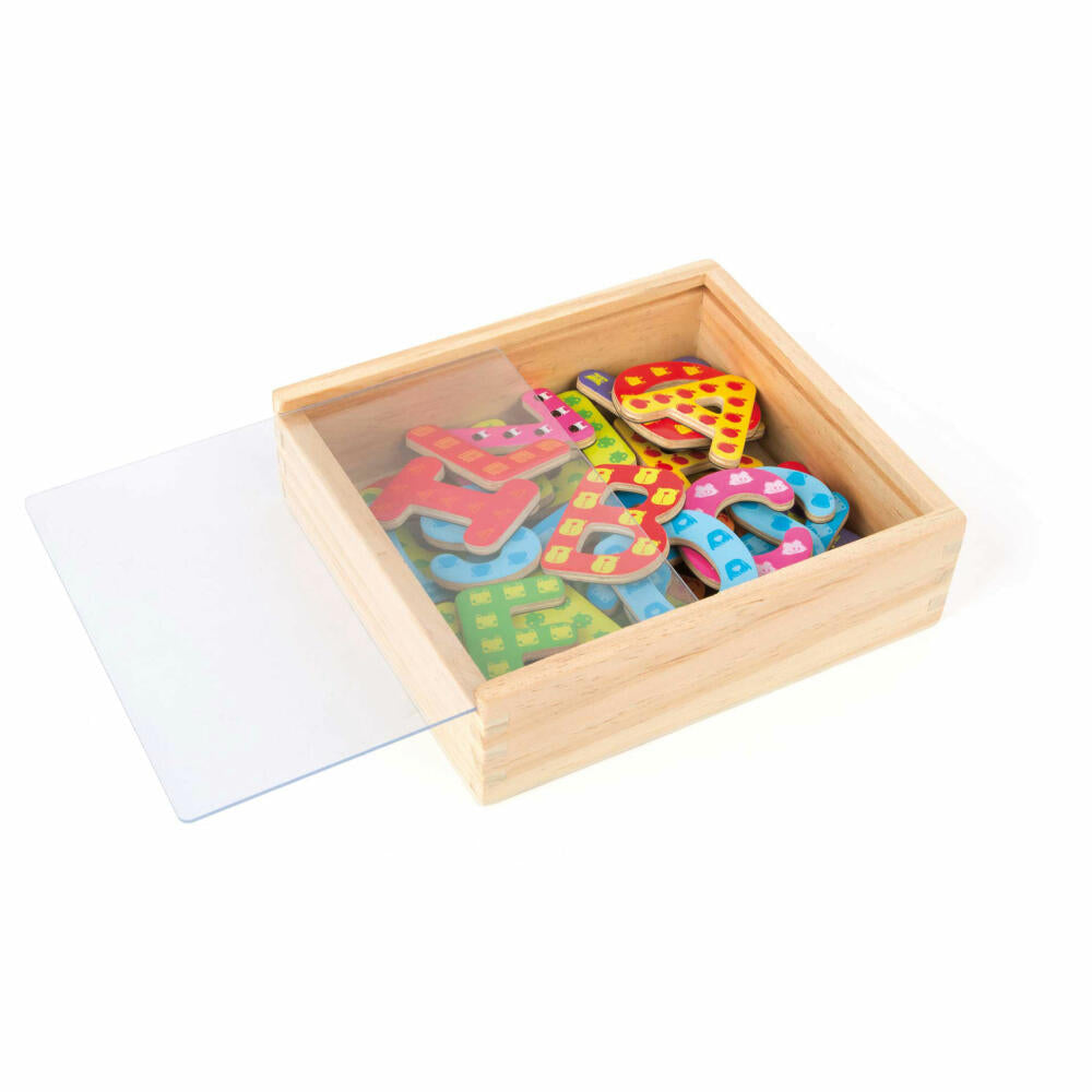 Komm, wir lernen das ABC! Aus wunderschön bemaltem Holz mit rückseitiger Magnet-Beschichtung laden die kunterbunten Buchstaben ein, erste Wörter zu schreiben. Jeder Buchstabe zeigt Motive mit passendem Anfangsbuchstaben. Die Buchstaben haften an allen magnetischen Untergründen - so kann der Kühlschrank oder die Tafel herhalten und ganz spielerisch die Welt der Buchstaben erobert werden. Die praktische Holzkiste ist der ideale Aufbewahrungsort für die 37 Teile in diesem Set. „Oma“, „Hallo“ oder „Auto“ - mit den Magnetbuchstaben unternehmen clevere Kinder ihre ersten Ausflüge ins Alphabet!