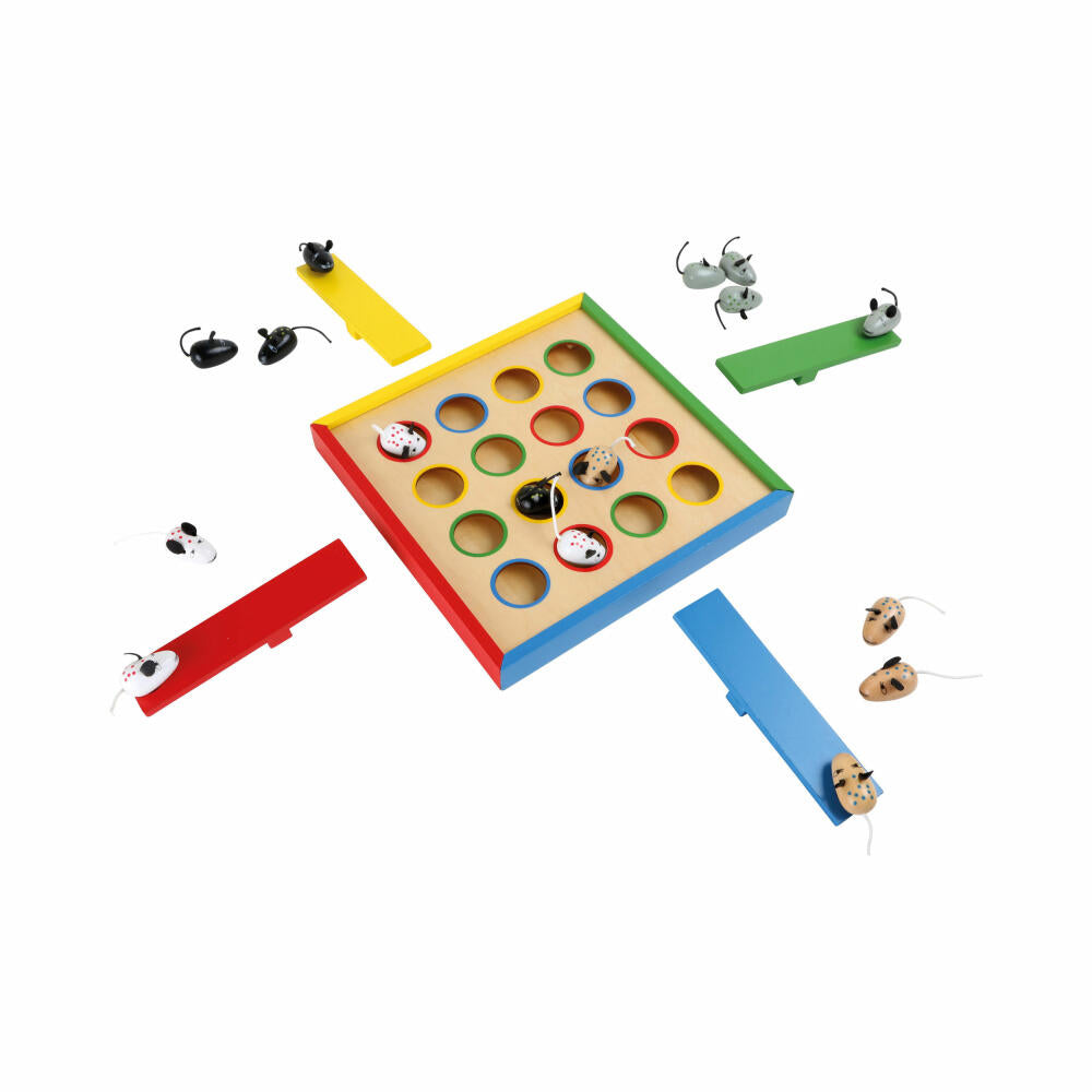 Spiel für 1 bis 4 Kinder. 16 Mäuse und vier Wippen. Mit der Schleuderwippe die Figuren in die Löcher katapultieren - eine Herausforderung für Jung und Alt! Durch unterschiedlich starke Schläge auf die Wippe werden die Geduld und Motorik der Kinder gefördert.