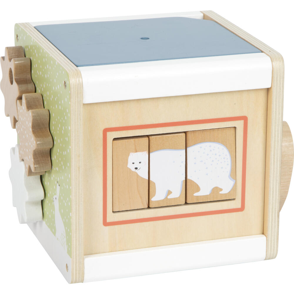Motorikspaß mit Schneehase, Eisbär, Robbe und Co.! Ein Allround-Talent in Bezug auf Spielen und Lernen ist dieser liebevoll gestaltete Motorikwürfel aus Holz, bei dem es auf fünf bespielbaren Flächen einiges zu entdecken gibt. Zwei Motorikschleifen, ein Formen-Steckspiel, ein Schiebelabyrinth, ein Drehklappen-Spiel sowie Zahnräder sorgen für langanhaltende Beschäftigung und vielfältige Lernmöglichkeiten. Dabei begleiten Robbe, Walross, Eisbär, Polarfuchs sowie weitere Motive arktischer Polartiere kleine Entdecker auf allen Würfelseiten und regen spielerisch die Neugierde an. Mit abnehmbarem Deckel, der platzsparend im Spielwürfel verstaut werden kann. Drehen, Stecken, Schieben, Klappen - beim Spielen und Entdecken wird nicht nur die Fantasie angeregt, sondern auch Geschicklichkeit, Feinmotorik und die Wahrnehmung von Farben und Formen sowie Ursache-Wirkung-Prinzipien trainiert. Moderne Farben, ein hoher sichtbarer Holzanteil und arktische Muster machen das Motorikspielzeug zu einem tollen Hingucker im Kinderzimmer. Mit abgerundeten Kanten für eine angenehme Haptik.