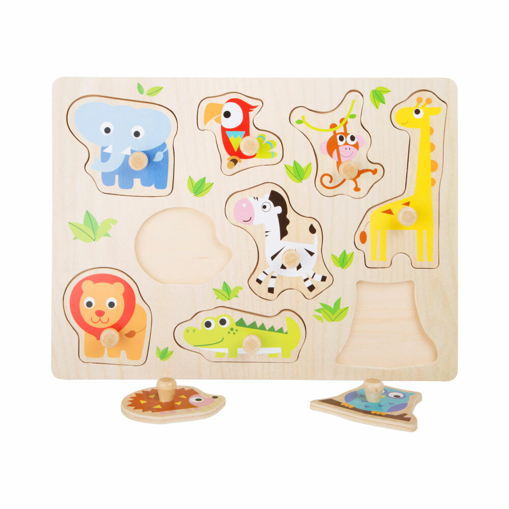 Ein kurzer Ausflug in den Zoo! Die bunten Zootiere zieren dieses wunderbare Holzsetzpuzzle. Da schwingt ein Affe an einer Liane und der große Uhu sitzt gemütlich auf seinem Ast. Der Löwe schaut freundlich in die Runde und die Giraffe versucht, ein paar Blätter zu erhaschen. Die Puzzleteile aus Holz haben einen Holzknopf, um sie gut greifen und einsetzen zu können. Hier wird die Feinmotorik des Kleinkindes gefördert und Geduld gelehrt.