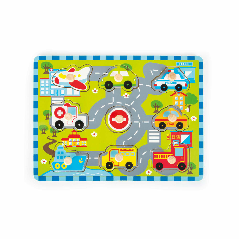 Tuuut tuut - wer fährt denn hier? Das neunteilige Setzpuzzle für die Kleinsten zeigt die ganze Welt der Fahrzeuge. Das einfache Spielprinzip macht das Legespiel zur ersten kniffligen Koordinationsübung für Fahrzeug-Liebhaber.Vom Flugzeug bis zum Schulbus können die Teile aus robustem Schichtholz mit dem großen Holzknauf leicht aufgenommen und an ihren Platz gesteckt werden. Tolle, leuchtende Farben und die hochwertige Verarbeitung versprechen jede Menge Spielspaß - das Setzpuzzle ist ein Highlight fürs Kinderzimmer und kommt nicht nur bei Jungs gut an!
