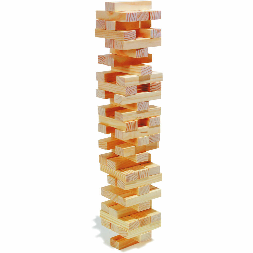 Aus Naturholz. Die Bausteine aus dem Turm ziehen und wieder oben auflegen, ohne dass der Turm einstürzt. Schult die Geduld und Motorik.