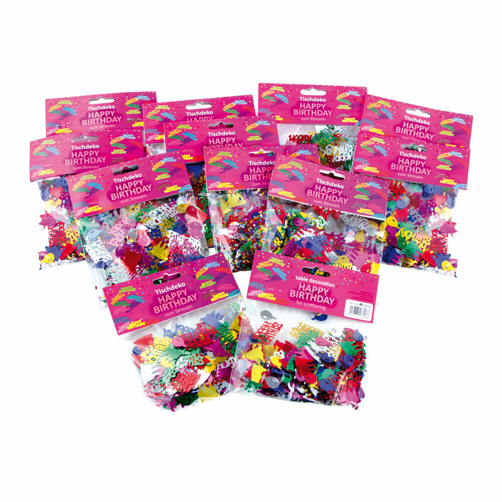 12er Set. Eine originelle Dekoration! Dieses flirrige Metall-Konfetti macht jeden Geburtstagtisch zum Highlight mit bunten, ausgestanzten Mini-Motiven wie Luftballons, Torten oder der Happy-Birthday-Schriftzug.