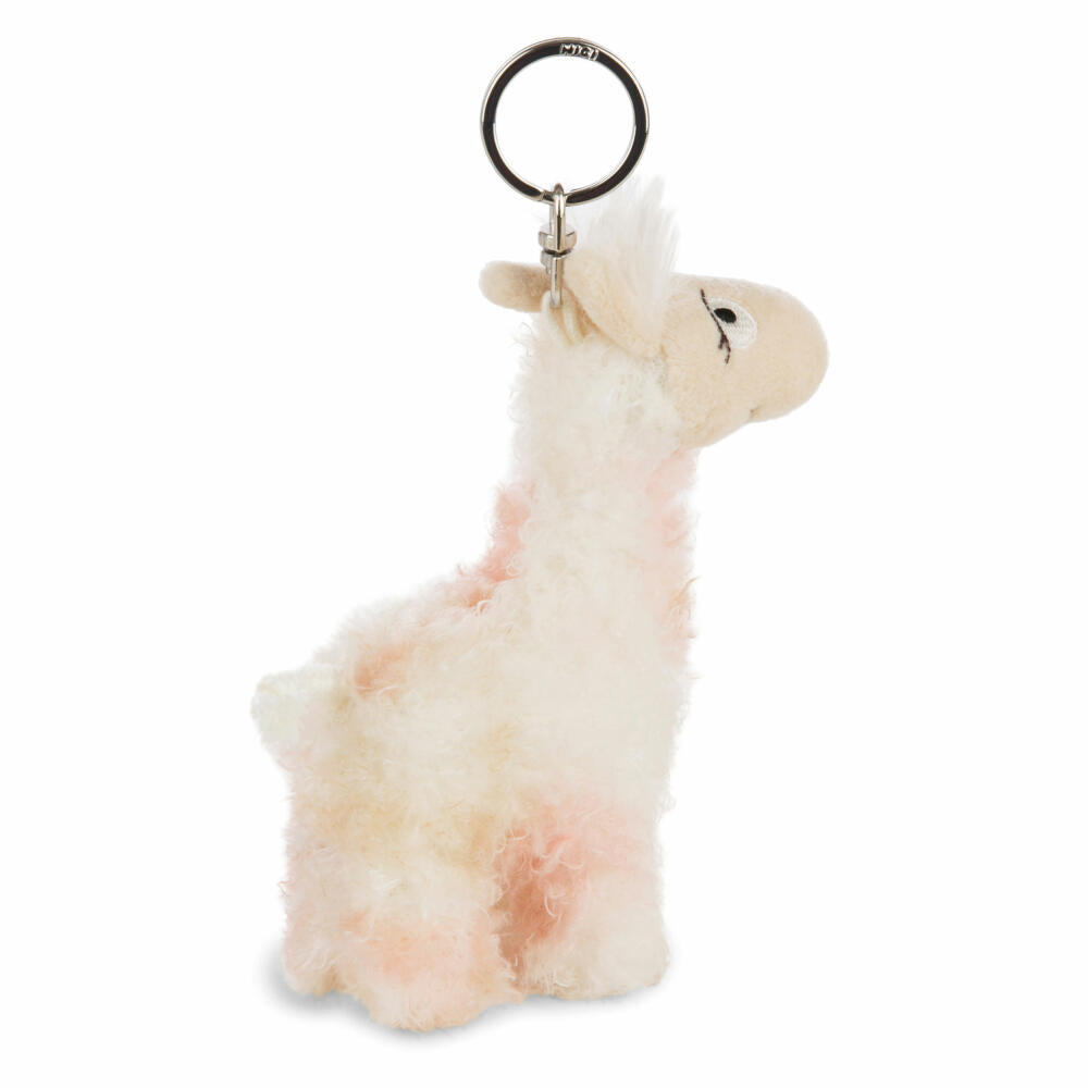 Flokatina das Lama als Plüsch-Schlüsselanhänger von NICI. Das kleine Plüschtier hat ein Kordelschwänzchen und einen Metallring am Kopf. Seim weißes Fell ist rosa und hellbraun gescheckt.