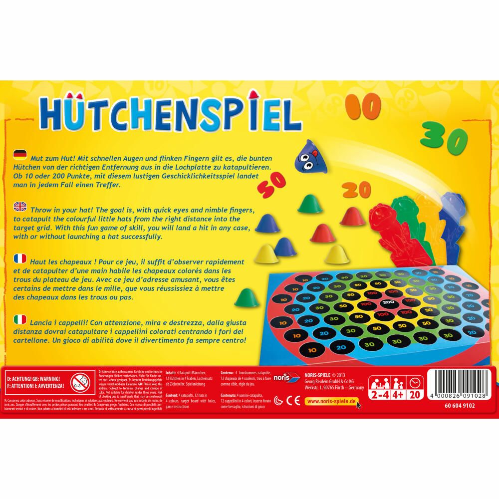 Das lustige Geschicklichkeitsspiel. Kindern macht es großen Spaß, die bunten, vorne beschwerten Hütchen aus der Entfernung in die Lochplatte zu katapultieren.