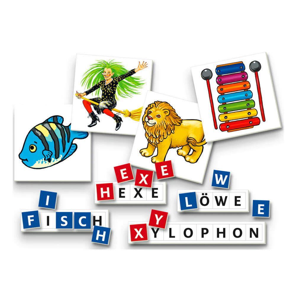Ideal ist es, mit den 34 Bild-Kärtchen zu beginnen und sie den Wortstreifen zuzuordnen. Dabei spielt der erste Laut (der Anlaut) eine große Rolle, denn jeder dieser Wortstreifen entspricht einem Buchstaben des ABC. Die verschiedenen Lauttypen sind mit unterschiedlichen Farben gekennzeichnet. Mit den insgesamt 140 handlich-großen Buchstaben kann das Kind die vorgedruckten Wörter nachlegen oder selbst Wörter aufbauen.
