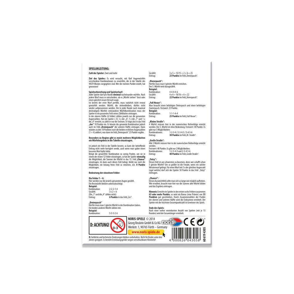 Noris Yatzy Spielblock, Notizblock, Würfel Block, Yatzee, für 3120 Spiele, 606194305