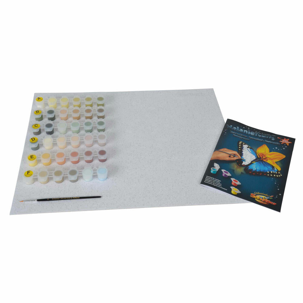 Im Lieferumfang enthalten: Stabiler Malkarton mit Leinenstruktur 40 x 50 cm, Acrylfarben auf Wasserbasis, feiner Malpinsel, Kontrollblatt, Anleitung