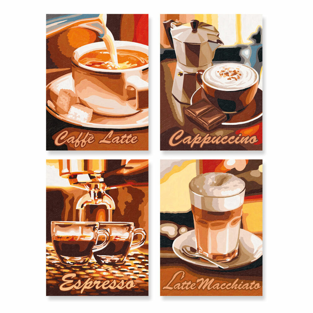 Schipper - Meisterklasse Quattro: Heute gibt’s zur Kaffeepause die große Auswahl: Entweder Caffè Latte, Cappuccino, Espresso oder Latte Macchiato. Die Malvorlagen haben eine fühl- und sichtbare Leinenstruktur, die dem fertigen Gemälde eine bessere Optik verleiht und den ausdrucksvollen Charakter der Bilder unterstreicht.