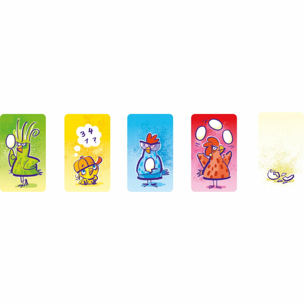 • Inhalt: 23 Karten Henne Heike, 23 Karten Henne Hilda, 23 Karten Henne Hedda, 8 Karten Küken Henry, 23 Karten Zerbrochenes Ei, 1 Spiegelei mit Quietsche