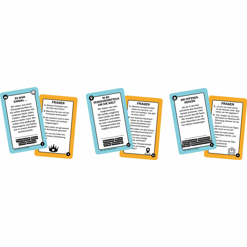 TELL ME MORE ist ein kreatives Erzählspiel, in dem ihr gemeinsam eine vorgegebene alltägliche, fantastische oder auch total verrückte Situation mit Details ausschmückt. Lasst eurer Fantasie freien Lauf, aber orientiert euch an den Schlüsselwörtern, denn nach 2 Minuten werden hierzu Fragen gestellt. Nun gilt es, als Gruppe die gleiche Antwort zu geben - allerdings ohne vorherige Absprache! Versucht gemeinsam gute Antworten zu finden, noch bevor ihr die Fragen kennt! Wie soll das gehen? Lasst euch etwas einfallen!