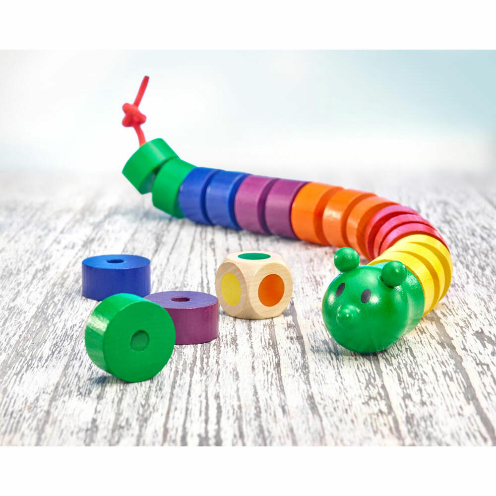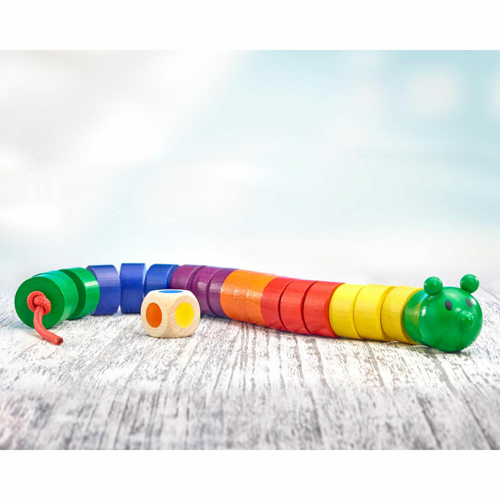 Wenn die Farbreihenfolge der bunten Ahornscheiben stimmt, schlängelt sich die putzige Raupe in ihrer ganzen Farbenpracht durchs Kinderzimmer. Dazu brauchen die Kinder Würfelglück und Fädelgeschick. Klassisches Farbenlernspiel mit Motoriktraining.