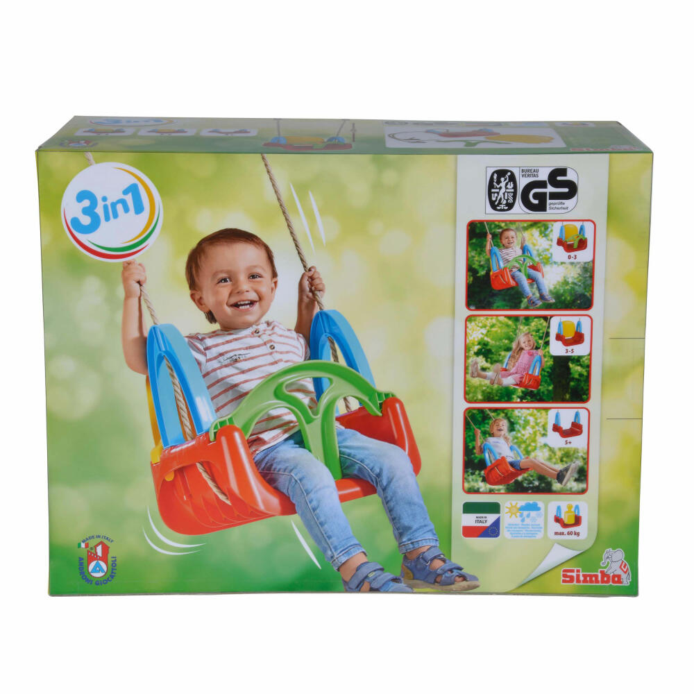 Wachse mit der coolen 3-in-1 Schaukel. Sie kann je nach Altersgruppe verändert werden. Für die einzelnen Altersabschnitte (0-3, 3-5 und ab 5 Jahren) gibt es entsprechende Sicherheitseinstellungen für die Schaukel. Durch einfache Montage der Rückenlehne kann die Schaukel schnell dem Alter des Kindes angepasst werden.