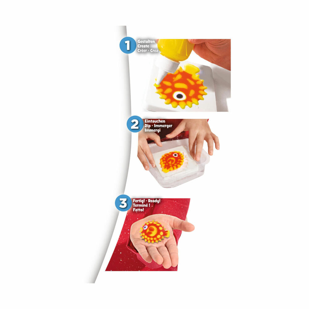 Einfache Anwendung: Man gibt die verschiedenen Farbgele nach Belieben in die enthaltenen Formen und taucht diese anschließend in das Wasserbad. Innerhalb von Sekunden verwandelt sich das Gel von einem flachen Motiv in eine tolle 3D Figur. Kinder können die Figuren individuell gestalten und anschließend damit spielen.